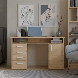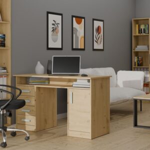 Wyposażone w 4 szuflady oraz zamykany 1 drzwiami schowek z 2 półkami, zapewnia dużo miejsca do przechowywania dokumentów, książek czy akcesoriów biurowych. Dodatkowa otwarta półka pod blatem idealnie sprawdzi się na drobne przedmioty, laptopa czy zeszyty.